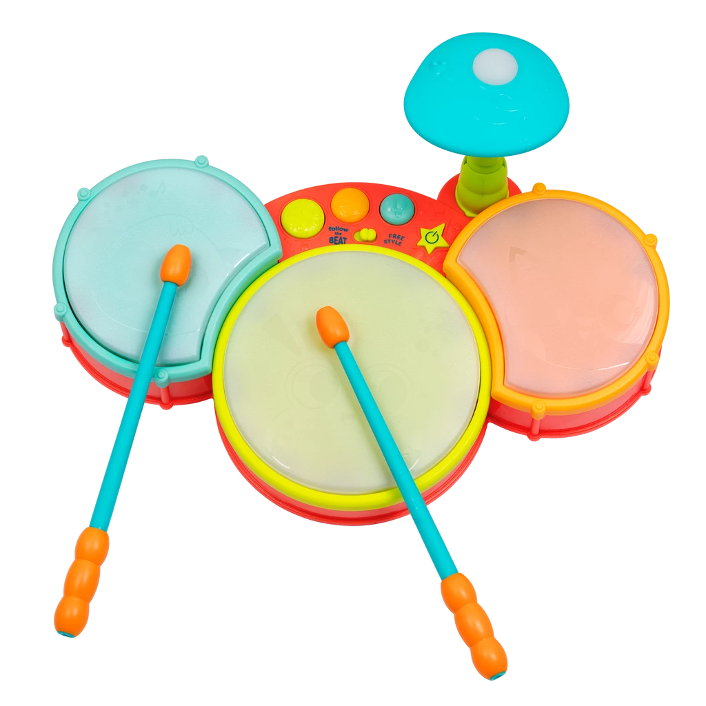 Drum to the beat – what a musical treat! The Little Beats drum set from Land of B. comes with a ton of fun features for your little musician to explore. Grab the drumsticks and choose from 2 music modes: tap the drum pads as they light up in Follow the Beat mode or create your own beat in Free Style mode!
