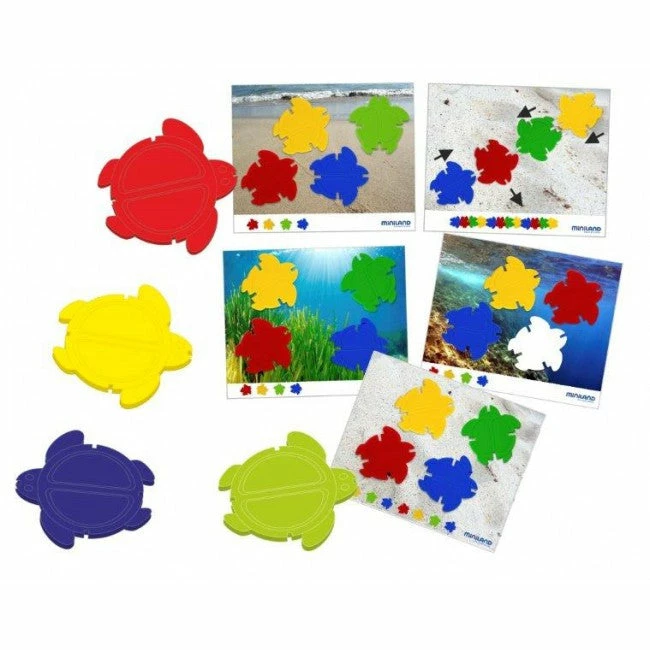 The activities cards cover a series of exercises to help children identify the orientation and colour of the turtles by placing the plastic figures in the correct position.