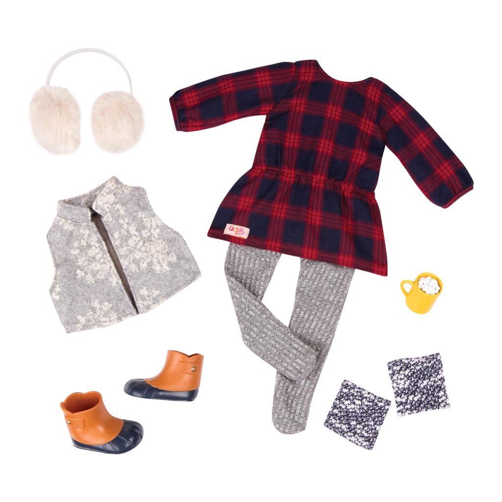 The red plaid tunic has long sleeves to keep your favorite dolls warm, even on chilly days. Layer it over top of warm gray tights, with extra warmth from a matching pair of leg warmers. Sparkle in the snow with the silver sequined vest over top, and for style thatโs as warm as it is cute, dress your doll in the fuzzy earmuffs. Chilly weather has never looked more stylish!