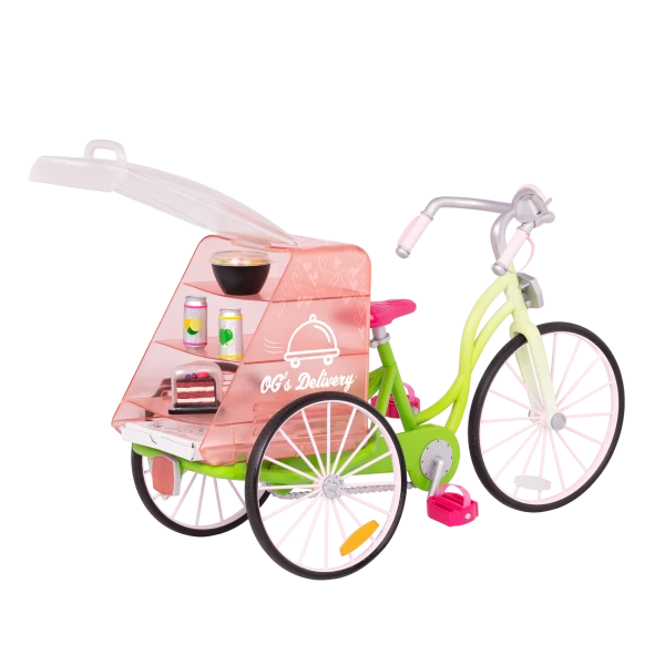 Deliver delicious meals around the neighborhood with the Our Generation Delivery Bike for 46cm dolls! Place the pizza in the pizza box and put the takeout lids on the salad bowl and cake, then place them in the delivery basket and get ready to ride!