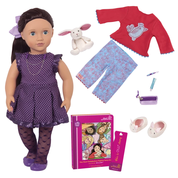 This beautiful 18-inch doll has bright blue eyes and long, straight dark-brown hair styled in a side ponytail with a bow. Have fun brushing and styling Willow’s hair any way you like it best! Deluxe dolls are posable and can bend at the knees and elbows as well as rotate at the neck, shoulders, and hips. Willow comes with two complete outfits including a pajama set with bunny slippers and a lovely purple party dress.