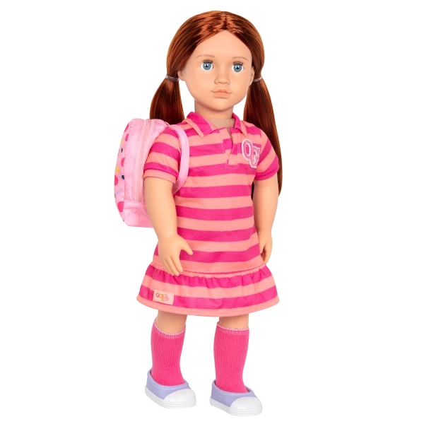 Get Kimmy ready for her first day at Awesome Academy! This Our Generation 18-inch doll has bright blue eyes that open and close, and her long red hair is fun to brush and style before heading to school! Kimmy can rotate her neck, arms, and legs to easily change outfits. She is wearing a cute, striped dress in shades of pink with an OG crest, matching knee-high socks, and comfy shoes.