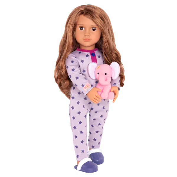 Have ele-phantastic dreams with Maria! Maria is a 46cm non-posable Our Generation doll with light brown hair and brown eyes. She is all ready for bed in a cosy onesie and comes with slippers and her elephant stuffy.