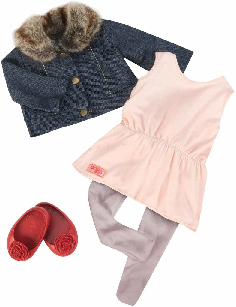 Keep your Our Generation doll cosy, comfy and classy in this stylish autumn outfit! The tailored denim jacket has a soft faux fur collar that’ll keep your doll warm for those chilly autumn days while the light pink dress, tights and red shoes give this cool ensemble that extra pop for a trendy look.