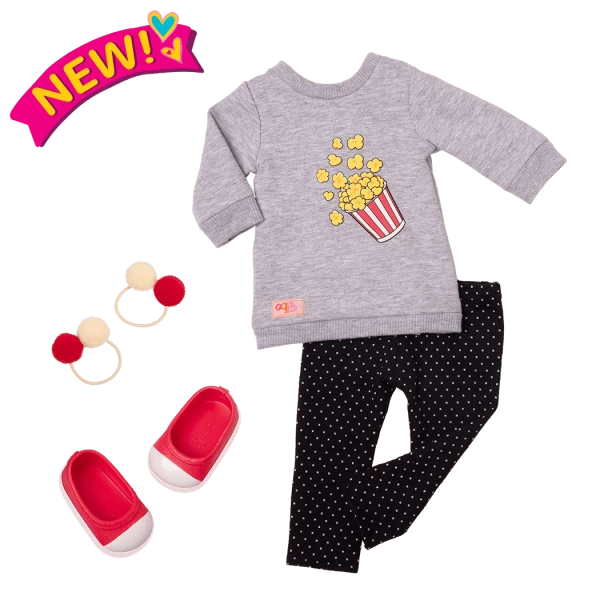 Get ready for a night at the movies with the Our Generation Pop-Pop Top outfit for 18-inch dolls! Easily slip on the pair of polka-dot leggings and keep cozy with the popcorn-print sweatshirt. It features easy-open closures to quickly put on and remove, so your besties will be ready just in time for the feature presentation! Give your dolls super fun hairstyles as you accessorize with the 2 pom pom hair elastics, then easily slip on the bright red shoes to complete the ultimate movie look. Theater fashion is always in style!