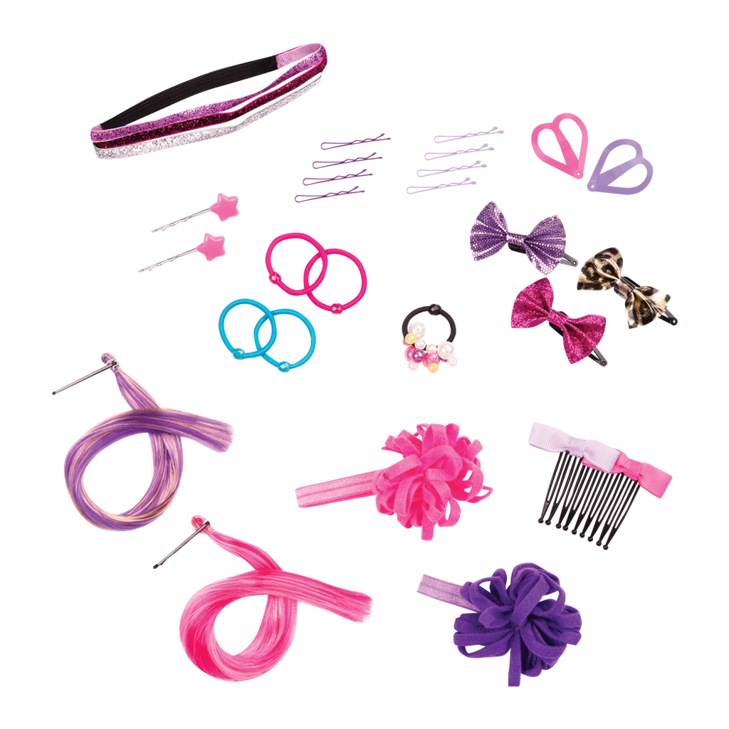 Bright, sparkly metallic colors and little touches of rockin’ glamour like leopard print give this set a playful edge. Sweet details like bows and frills sweeten the look. The colorful hair extensions can make any Our Generation doll look just like Layla (the musician doll with purple hair)! All the hair accessories can be used on both dolls and kids, so have fun experimenting with all the exciting hairstyles you can imagine! (Please remember to keep your dolls away from real heat and water to avoid damage.)