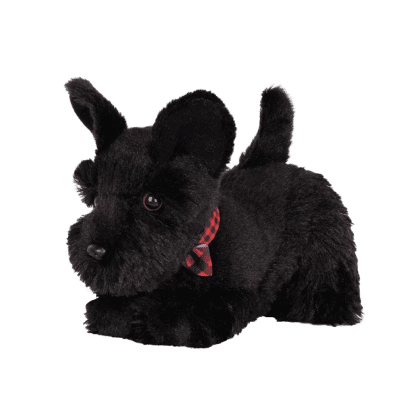 This 6-inch loyal pal Scottish Terrier Pup has posable legs, so your pup can sit, lie down, stretch, and shake a paw! Its black plush fur is super soft, and it comes with its very own collar in a cute bow tie. When itβs time for a walk, easily clip the leash to the collar and explore the neighborhood with your puppy safely by your side!