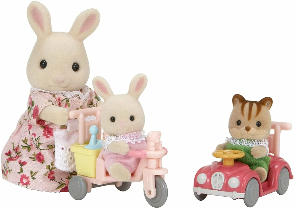 Mother rabbit takes babies to ride around a park in their new push car and tricycle! Set includes mother rabbit, baby rabbit and squirrel, tricycle with basket & rotating wheels, car with rotating steering wheel & tyres, 2 attachable push handles, watering can and shovel.