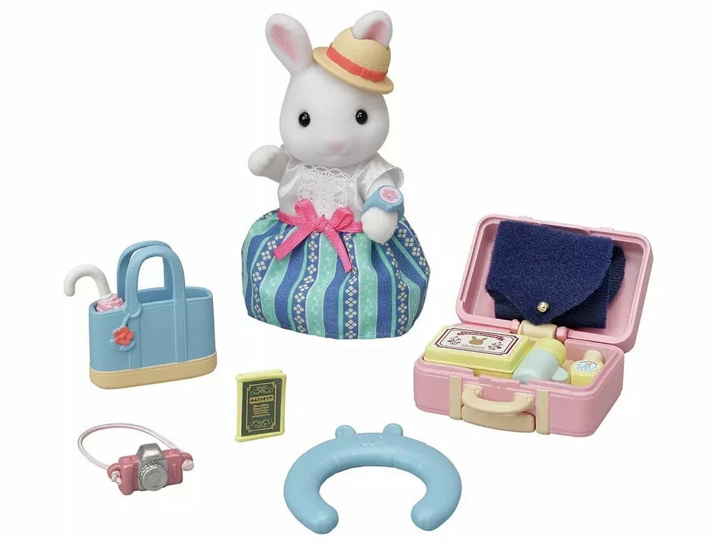 The Weekend Travel Set contains Snow Rabbit mother Emilia in an exclusive outfit, plus a suitcase, handbag, neck pillow, and travel accessories. Pack the suitcase and handbag for pretend travel play.